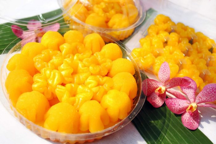 Ở Thái Lan, những món đồ ngọt có màu cam như thế này thì hơn 90% được làm từ lòng đỏ trứng với bột đường. Chi với 2 nguyên liệu cơ bản này mà được bàn tay nghệ nhân chế biến thành nhiều món với nhiều hình thù khác nhau. Từ sợi mỏng, đến các loại bánh hình tròn rồi cả hình bông hoa nữa. Từ những hình dạng này mới có những tên bánh siêu đáng yêu như: tong yip, tong yord hay foi tong.