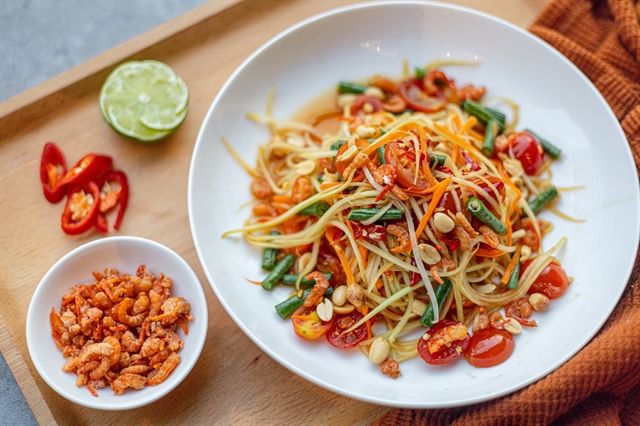 Gỏi Đu Đủ hay còn gọi Somtum là một món salad Thái truyền thống, chế biến từ rau sống như cà rốt, dưa chuột, ớt và xà lách, kết hợp với nước sốt chua ngọt, nêm gia vị. Đặc biệt, somtum thường có một chút cay nồng từ ớt và mùi thơm của tỏi. Món ăn này vừa giòn, vừa mát, hoàn hảo cho những ngày nắng nóng. Sự pha trộn của các thành phần tạo nên hương vị độc đáo, đầy sức hấp dẫn, khiến ai thưởng thức cũng không thể quên.