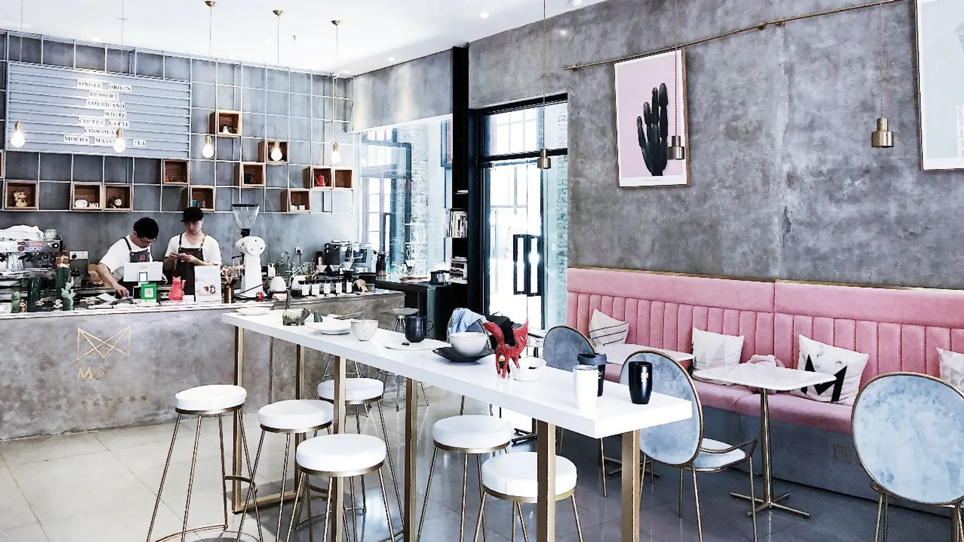 Bên trong MO+ Cafe có nội thất hiện đại nhưng tối giản với những bức tường màu xám tạo thành một background hoàn hảo làm nổi bật những chiếc ghế màu vàng và màu hồng pastel. Đến đây, bạn sẽ có cảm giác như lạc vào một studio chứ không phải một quán cà phê bình thường.