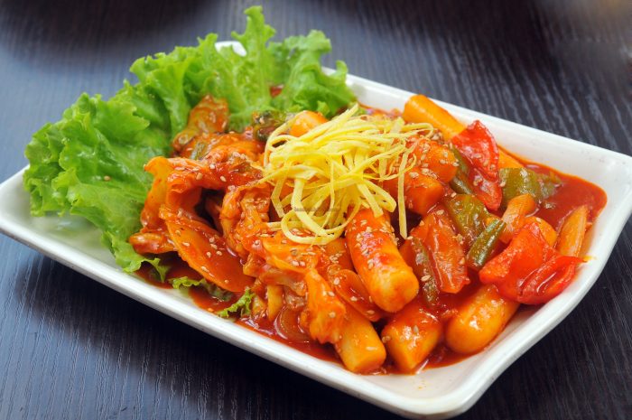 Đến du lịch Hàn Quốc bạn sẽ bắt gặp những gian hàng bình dân bày bán các món ăn dân dã như xien que, chả hấp nhưng đặc biệt nhất vẫn là món bánh gạo Tteokbokki. Tteokbokki có màu cam được phủ một lớp nước sốt ớt có vị cay nồng rất đặc trưng.