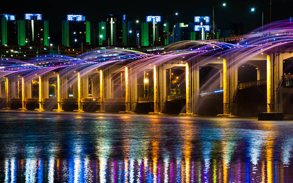 Cầu Banpo là cầu nối quận Seocho và quận Yongsan của thủ đô Seoul với hệ thống phun nước cầu vồng cực kỳ đẹp vào buổi đêm. Các vòi nước nhảy múa theo nhạc, quyện chung với hệ thống ánh sáng bật sáng từ trong dàn cầu hắt ra, tạo nên dải màu cầu vồng nhấp nhô uyển chuyển mềm mại đầy huyền ảo khiến bạn sẽ phải ngỡ ngàng trước khung cảnh đẹp thế này. Hãy đến và chiêm ngưỡng cảnh đẹp này đi thôi nào!